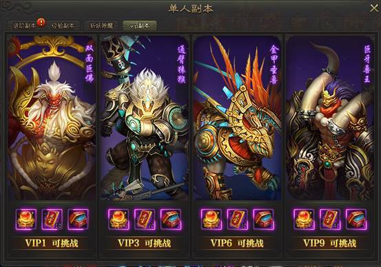 1、玩家等级达到21级后且VIP等级达到VIP1、VIP3、VIP6、VIP9后才可以相应开始挑战双面巨佛、通臂猿猴、金甲圣兽、巨牙兽王VIP副本。