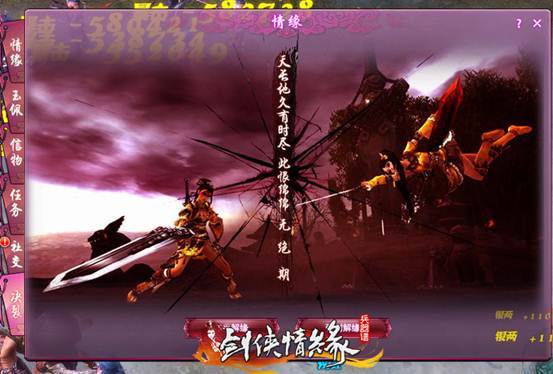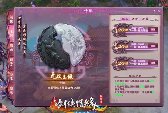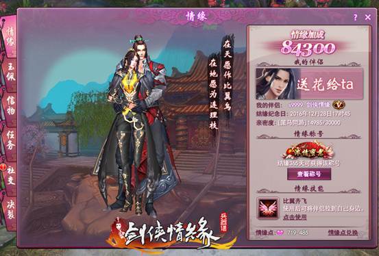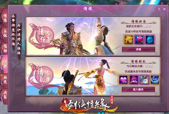情缘属性和任务:双方结为情缘后,可在情缘界面查看伴侣的详细信息,同时获得稀有称号,当双方结缘达到一定天数后还会获得更加稀有的情缘专属称号。同时,情缘间还可使用专属情缘技能,从而立即到达伴侣身边;另外情缘双方还会获得“玉佩和信物”,这些专属道具都可以进行升级,从而提升情缘双方的战斗力;升级道具的来源为每日的情缘任务