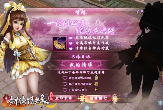 开启等级:玩家达到35级时,可开启情缘系统,与心仪的Ta结为情缘