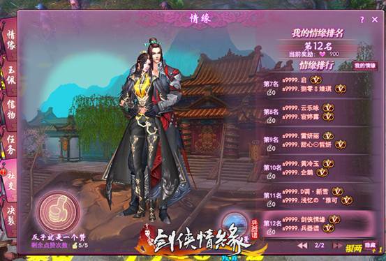 情缘社交:在次功能中,玩家可通过本服情缘排行为其他情缘点赞,点赞排行越高获得的奖励越多。同时,玩家还可以自由更换情缘背景图。